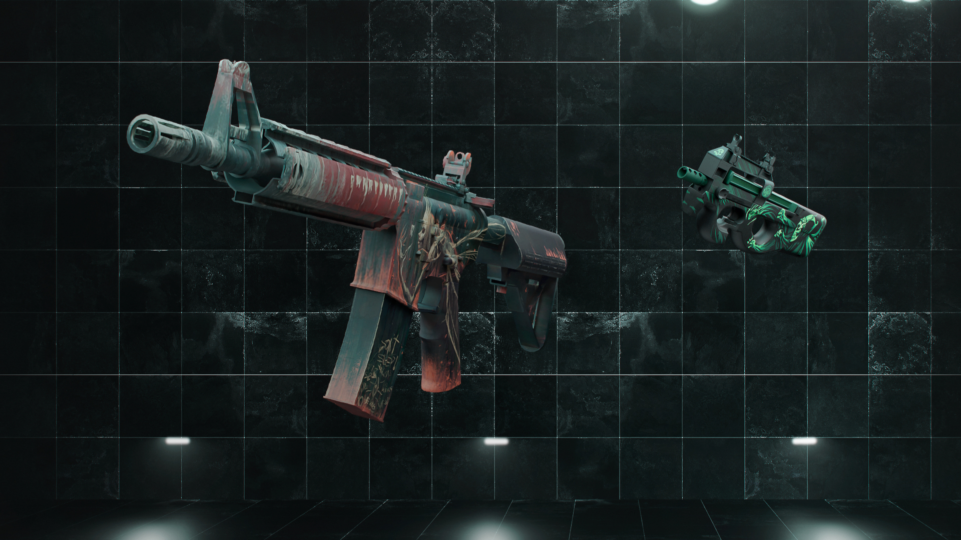The P90 Grim features a dark, ominous design with a green, glowing skeletal figure and intricate web-like patterns, giving it a grim reaper-inspired look. The eerie combination of dark tones and vibrant green accents makes it visually appealing for players seeking a spooky, death-themed skin.