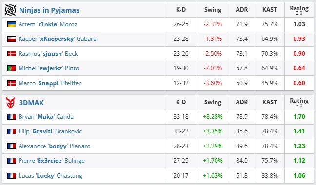 Ninjas in Pyjamas, on the other hand, looked lost: they lost opening duels, failed retakes even with numerical advantage, and their attacking entries became predictable and easy to counter. In late-rounds the team repeatedly fell into chaos, losing any sense of structure — and without proper adaptation to 3DMAX’s disciplined aggression, the outcome became inevitable.