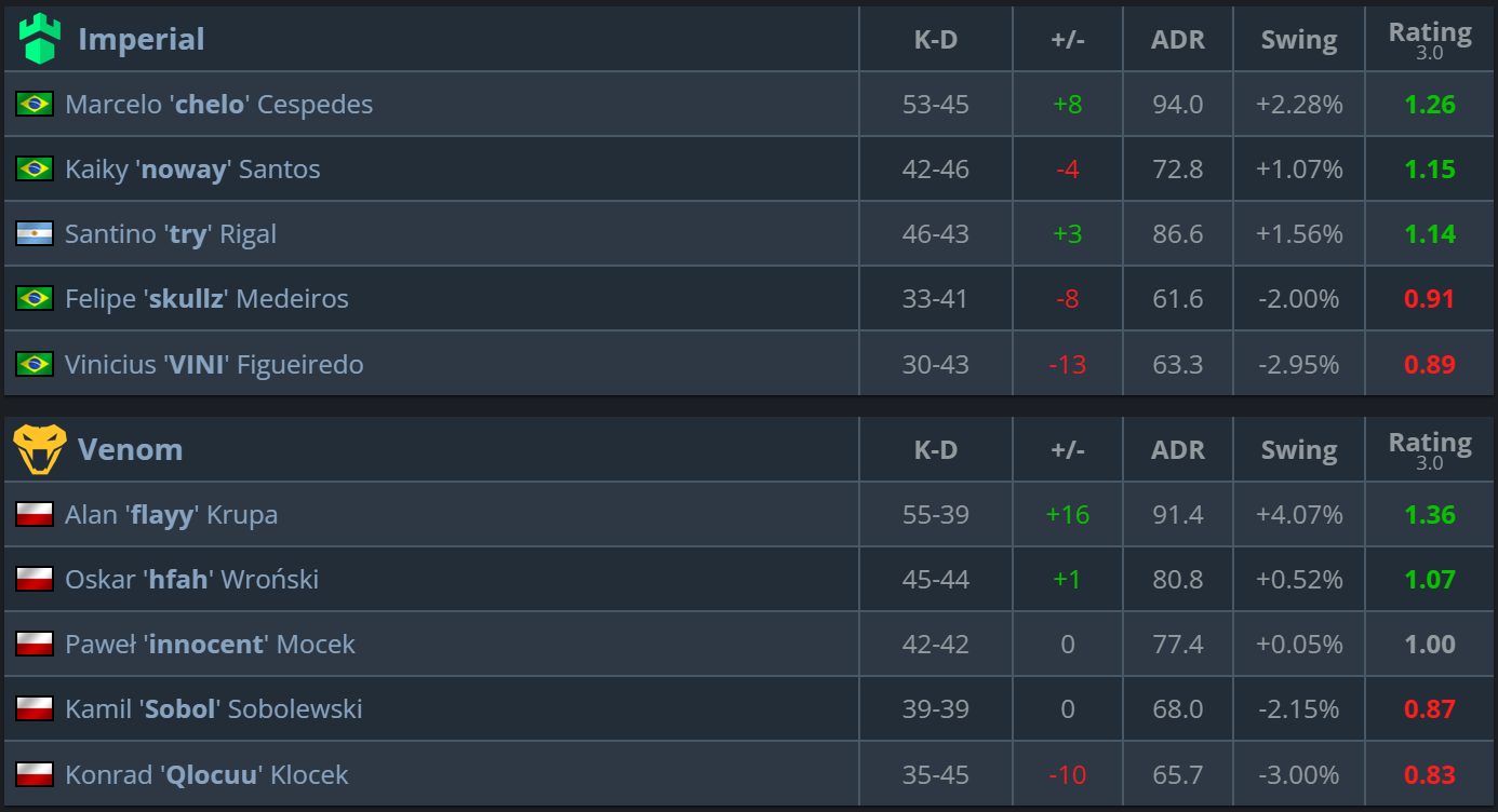 3. Dust2 (decider) — 11:13. The most intense map of the series. Venom held their ground despite a strong comeback from chelo and try, closing the game in the final round thanks to a clutch from innocent.
