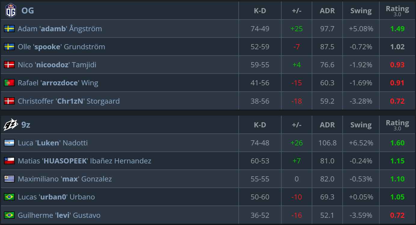 1. Train (9z’s pick) — 13:7. OG started strong, but 9z quickly adapted and imposed an aggressive style. Luca “Luken” Nadotti was the driving force of the squad (74–48 K–D, Rating 1.60), dominating duels and winning key clutch rounds.