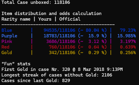 It is also telling that the drop distribution looks almost textbook-close to the official odds. Blue items account for about 80%, purple for 15.9%, pink for 3.12%, red for 0.64%, and gold for 0.29%. In other words, this whole story once again confirms the core principle of the case system: over a long enough distance, mathematics almost always defeats the player.