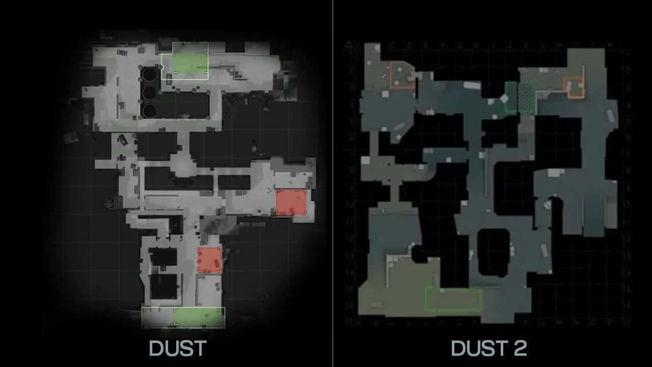 What is interesting is that this map style wasn’t so much invented as it basically evolved over time. To try and illustrate what I mean, let’s look at the overviews of Dust and Dust2: