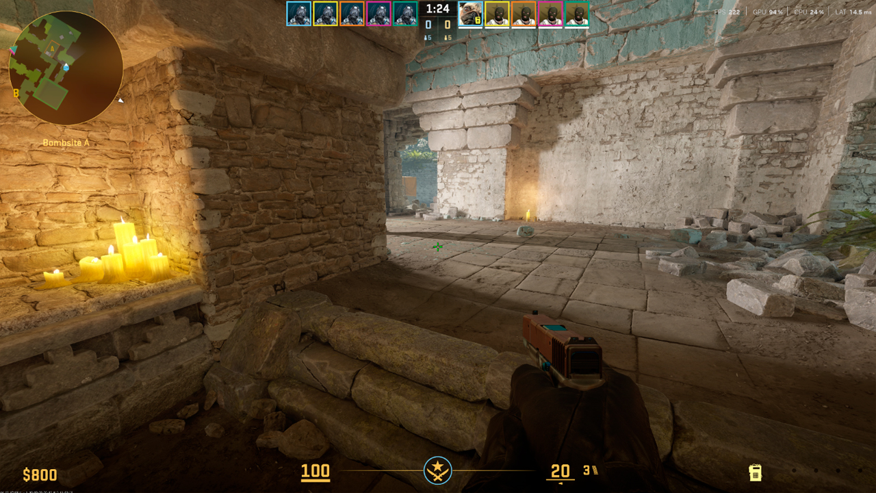 But what does any of this have to do with reflections? Well, let’s take one more detour before we get there. At its core I think one of the most important pillars of Counter-Strike is information. The most easily understood kind is visual information, as in, can you see someone? But I would argue we have a sub-category of information already that I think we could call information-leaking. The most obvious case of this is the shadow advantage you might have in certain positions, perhaps most noticeable on ancient with the flood lights: