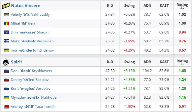 Mirage began as NAVI’s best opportunity. The map remained competitive throughout regulation, with NAVI finding moments of success through mid control and late-round trading. However, once the score tightened, Spirit’s individual firepower tilted the balance. Key multi-kill rounds from donk pushed the map into overtime, where Spirit closed it out 16:14 — a psychological blow that shifted the series entirely.
