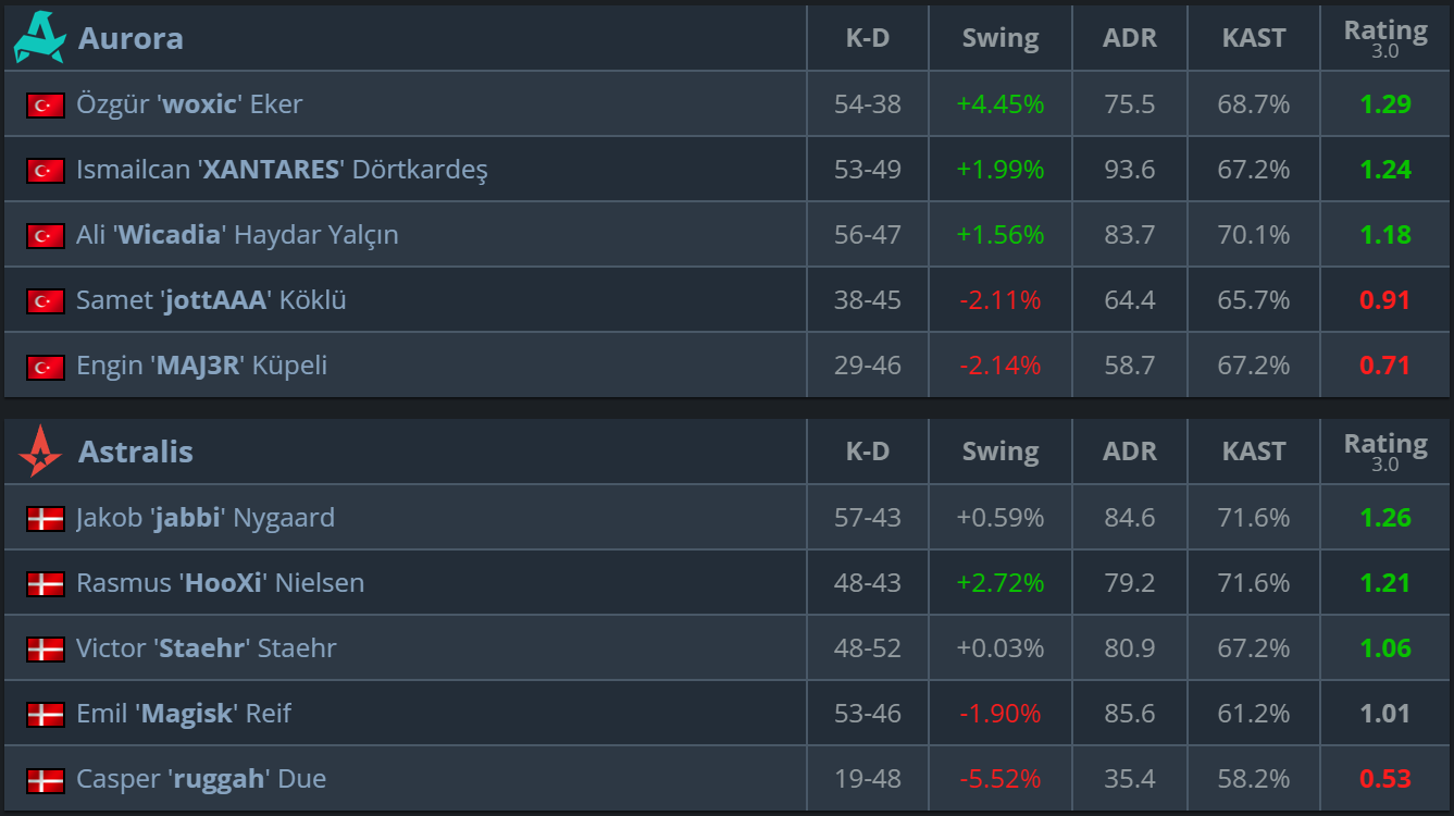 Aurora defeated Astralis with a 2:1 scoreline (10:13 Nuke, 13:8 Train, 13:10 Mirage) in the decisive match of the Swiss stage.
