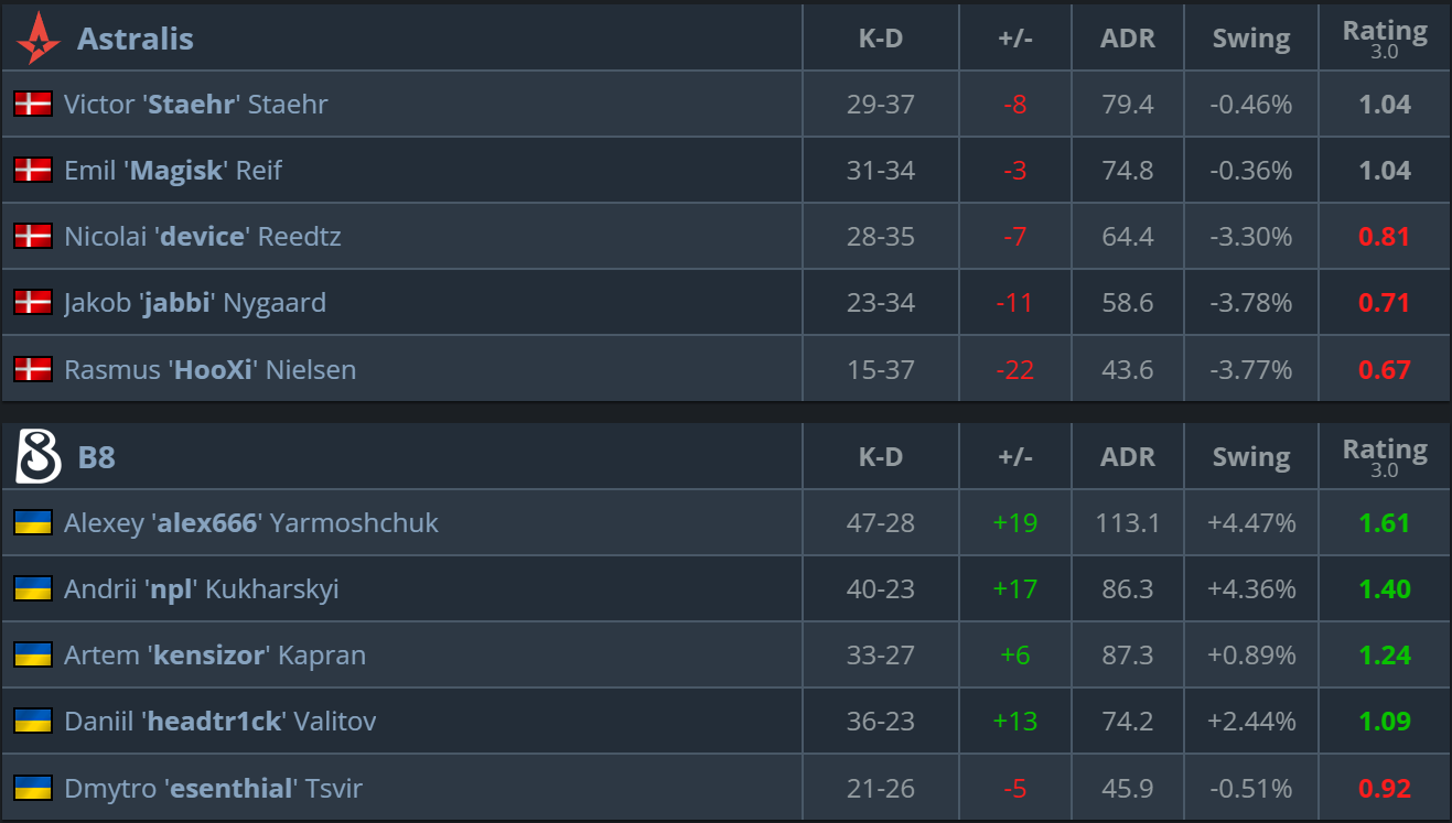 - Ancient (Astralis pick) — 13:4. Complete domination by the Ukrainians. Astralis looked disoriented, while kensizor and headtr1ck consistently closed out rounds in favor of B8.