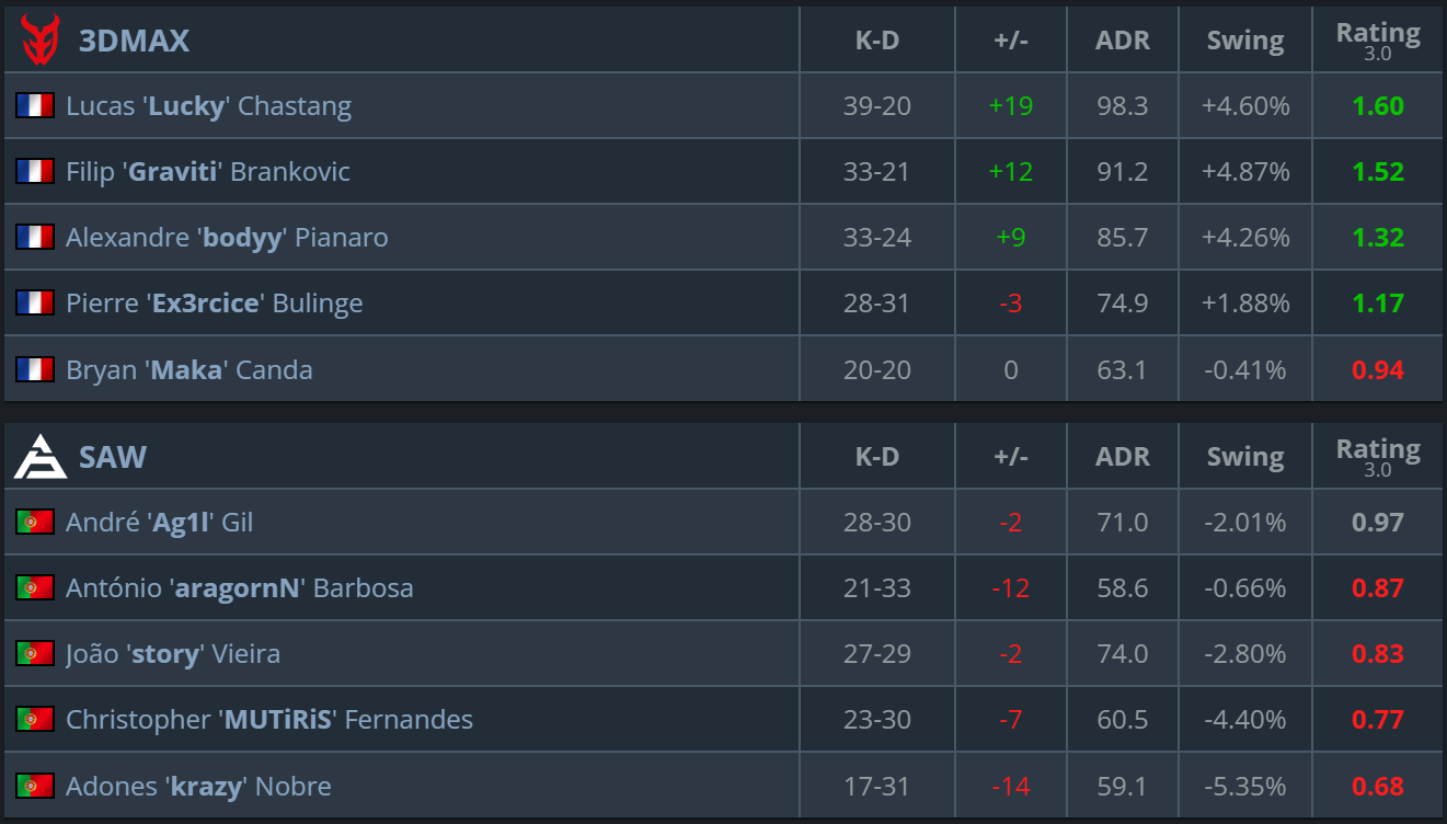 The French lineup 3DMAX demonstrated disciplined and confident play, defeating SAW 2:0 (13:5 Ancient, 13:8 Nuke).