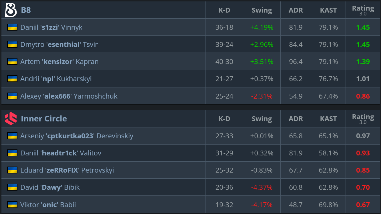 B8 began the series with a very important win on the opponent’s pick. Inner Circle kept the match close on the scoreboard, but the Ukrainian team played the key rounds better and managed to seize the opening advantage. - Mirage (B8’s pick) — 13:6
