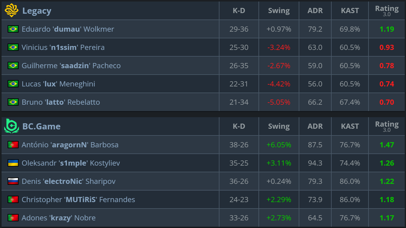 Key impact: Full control of the game tempo, dominance in AWP positions, and a decisive contribution in clutches on Overpass. His consistency created comfortable conditions for the whole team and gave Legacy no chance to bring the series back to an even footing.