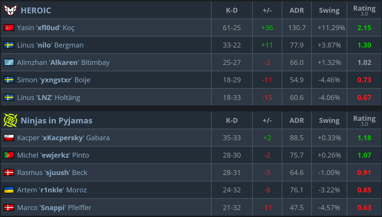 VRS rating after the match — HEROIC vs Ninjas in Pyjamas