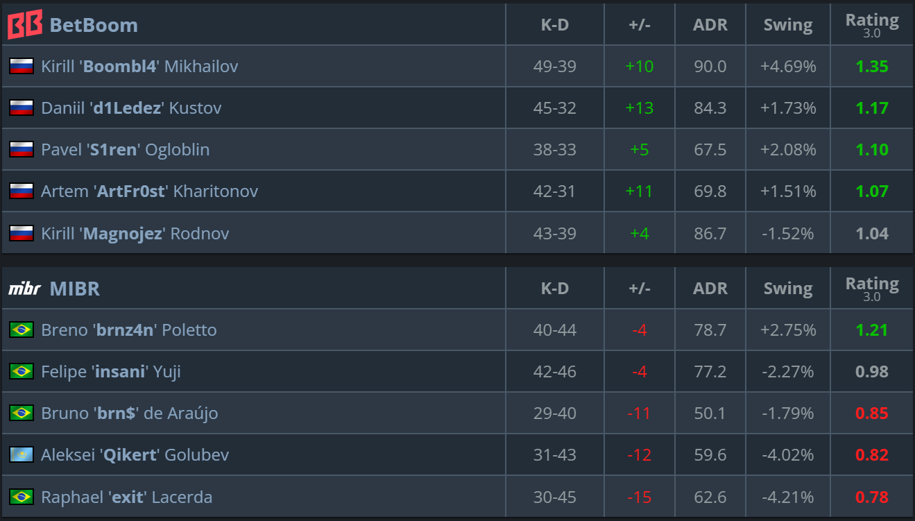 - Overpass (MIBR pick) — 13:1. Complete domination by BetBoom from start to finish. ArtFrost and d1Ledez displayed phenomenal consistency, leaving no chance for their opponents.