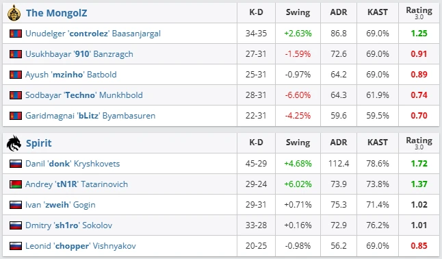Spirit entered the match under heavy pressure. A loss meant elimination, while a win kept their hopes alive. Dust2 became a one-sided display. Spirit played with discipline and structure. Moreover, donk delivered one of his best maps of the season with 112.4 ADR and a 1.72 rating. The MongolZ looked drained after the intense match against Passion UA. Their attempts to gain momentum were shut down by quick trades from tN1R and sh1ro. Ancient was more competitive. Even so, Spirit controlled the key rounds and finished the map with confidence. tN1R stood out again with several important openings and clutch plays.