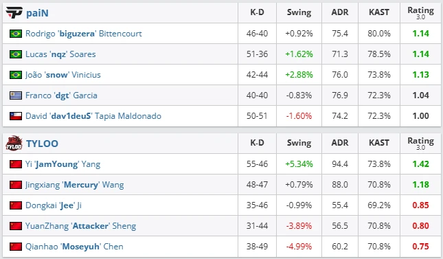 The stakes were clear. The winner advanced to the quarterfinals, while the loser was eliminated. The result was one of the most emotional series of the day. On Nuke, paiN looked sharp and focused. snow and nqz broke open sites again and again, leaving TYLOO without answers. Ancient shifted the momentum. TYLOO relied on their star JamYoung, who played an incredible map with a 1.42 rating. His aggression created constant pressure and brought the series to the decider. Overpass brought the final twist. paiN played a clean, disciplined map. biguzera was a defensive pillar, and dgt closed critical clutch rounds. As a result, TYLOO’s hopes collapsed.
