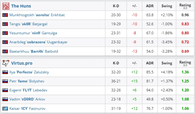 On Dust2, Virtus.pro continued to press forward, though The Huns managed to put up a fight, closing the gap to 10:12 thanks to nin9 and sk0R. Still, experience prevailed — FL1T sealed the final round with a double entry, and ICY’s confident AWP play finished the map 13:10, giving Virtus.pro a clean 2:0 series.