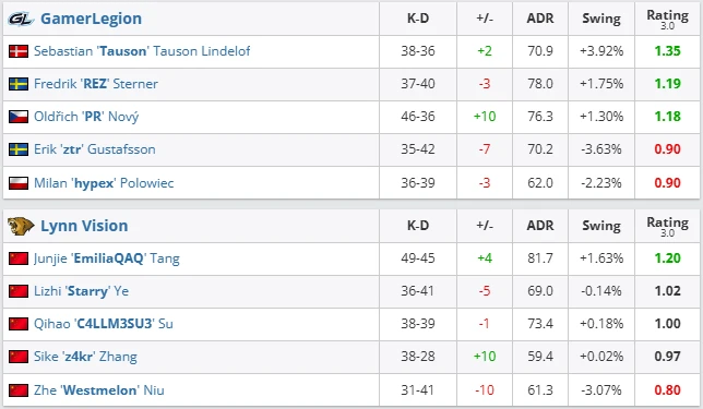 The second match of the day turned into pure drama. Lynn Vision, representing China, completed a comeback after losing the first map, defeating GamerLegion 2:1 (5:13 Overpass, 13:8 Train, 13:9 Inferno). The victory keeps the Chinese squad’s hopes alive in the lower bracket of Group A.