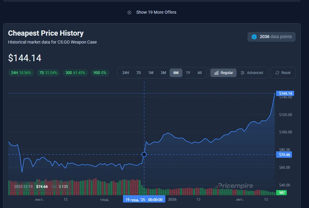 A clear example is the price movement of the CS:GO Weapon Case, one of the classic containers from the Counter-Strike: Global Offensive era. Over the past 30 days, its price has increased by more than 60%, while the 7-day growth exceeds 30%.