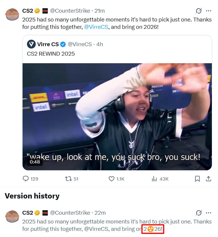A new wave of discussion has erupted in the CS2 community after a post on the game’s official account. The developers summed up the events of 2025 and ended the message with a phrase about 2026, using the biological radiation symbol emoji — the key visual hallmark of Cache. Fans interpreted this as a direct hint at the legendary map returning to the active competitive pool next year.