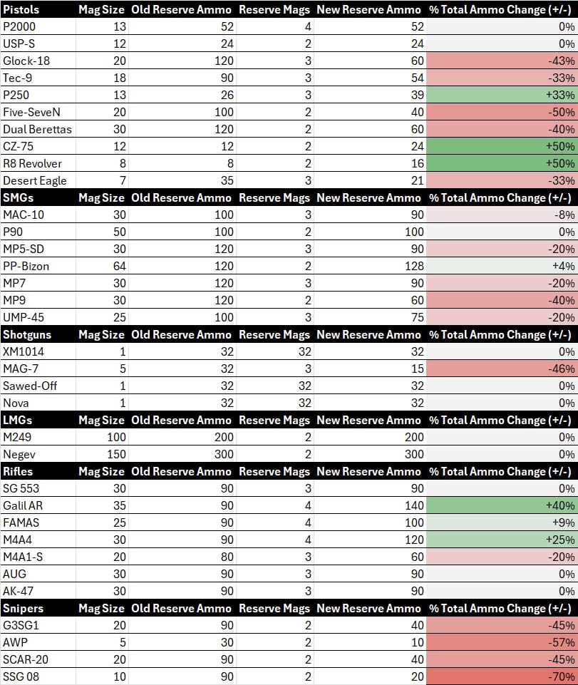 Among pistols, the biggest winners are the CZ-75 and R8 Revolver, both receiving a +50% increase in total ammo. The P250 also gets a noticeable buff (+33%), making it an even stronger eco option.
