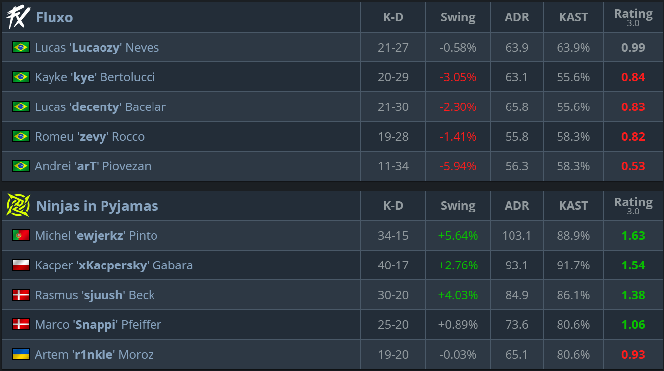 Ninjas in Pyjamas controlled the game from start to finish, not allowing Fluxo to create any real pressure on either map.