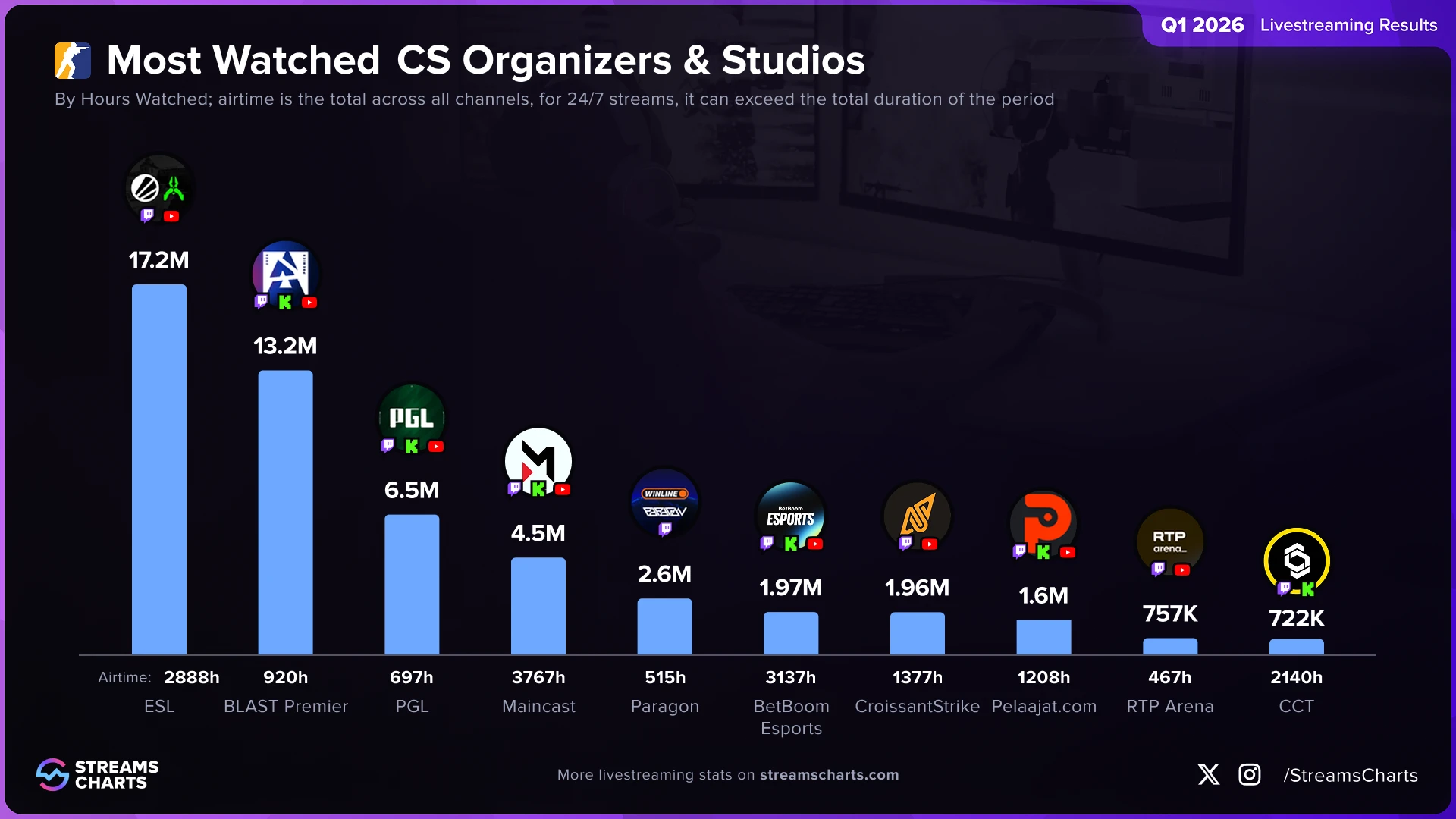 The first quarter of 2026 once again confirmed who controls the Counter-Strike tournament ecosystem. According to new data from Streams Charts, ESL became the most-watched Counter-Strike tournament operator and studio of Q1 2026, finishing ahead of BLAST Premier and PGL in total hours watched. The ranking reflects combined audience watch time across official broadcasts and related channels, offering one of the clearest indicators of who captured the most attention during the opening months of the season.