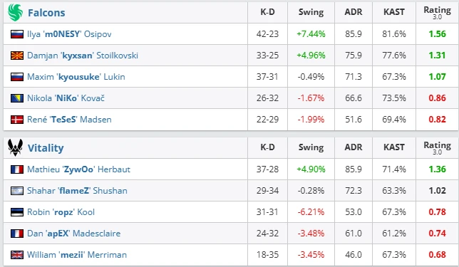 - m0NESY again became the engine: +7.44% swing, 85.9 ADR, key multikills.