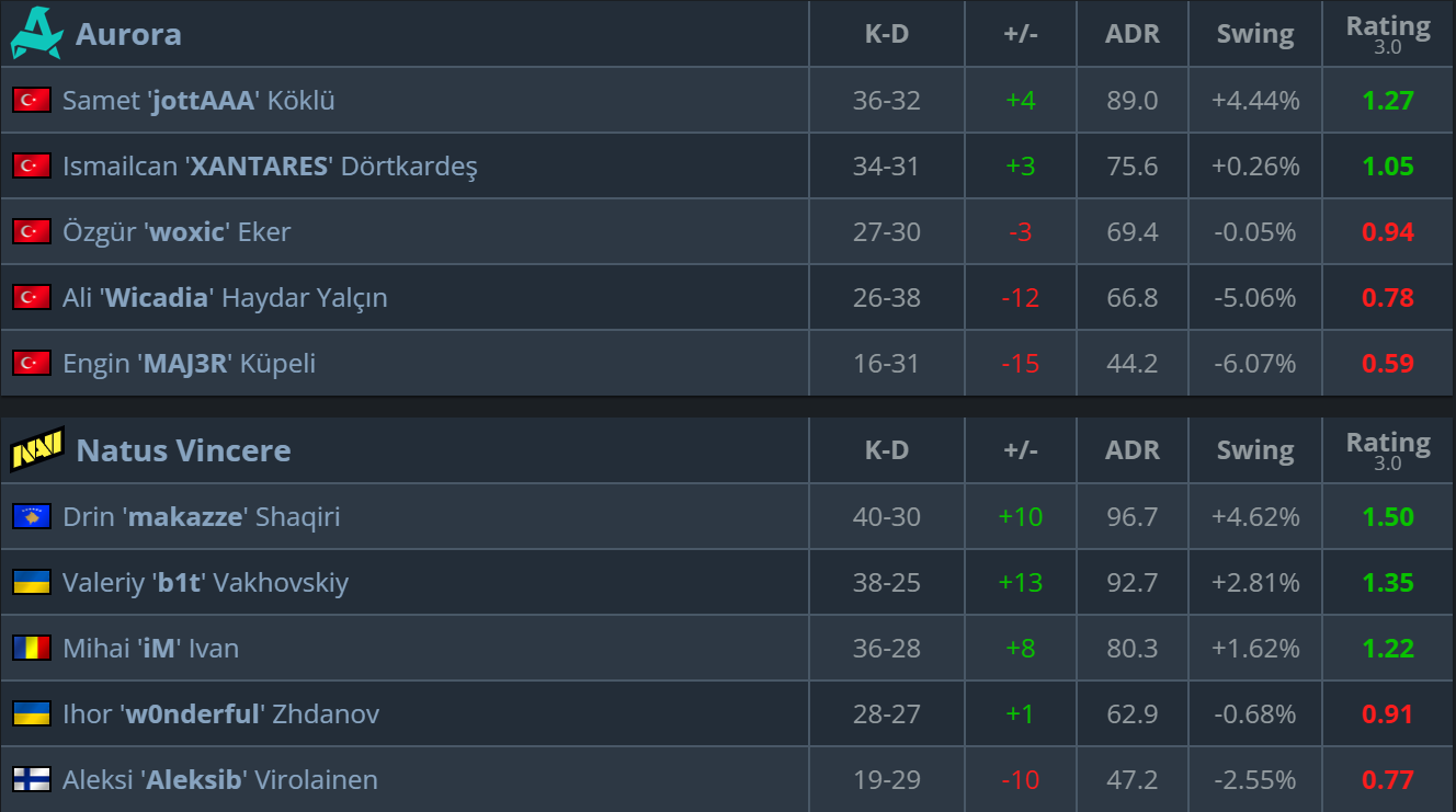 Aleksib’s team demonstrated excellent synergy — b1t and makazze secured key clutches, while iM provided consistent defense. - Dust2 (Aurora pick) — 13:10 for Natus Vincere.