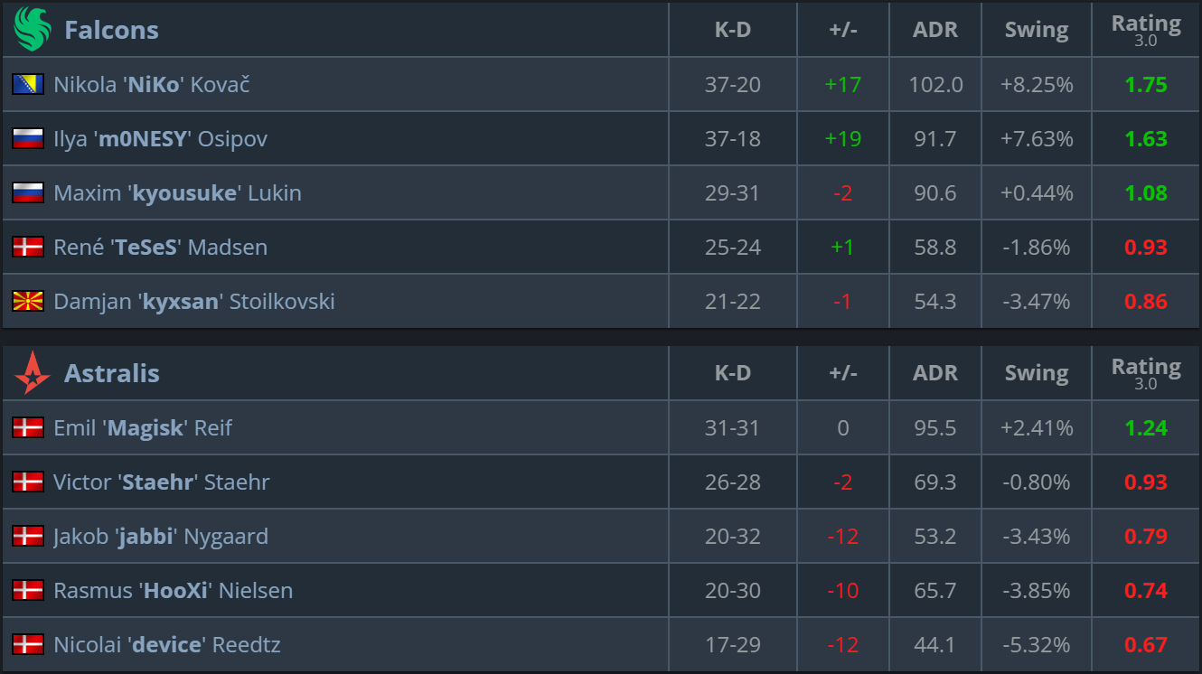 m0NESY and NiKo dismantled the Danes in duels, while TeSeS repeatedly punished their aggressive pushes. Map control and game tempo were entirely under the Falcons’ command.