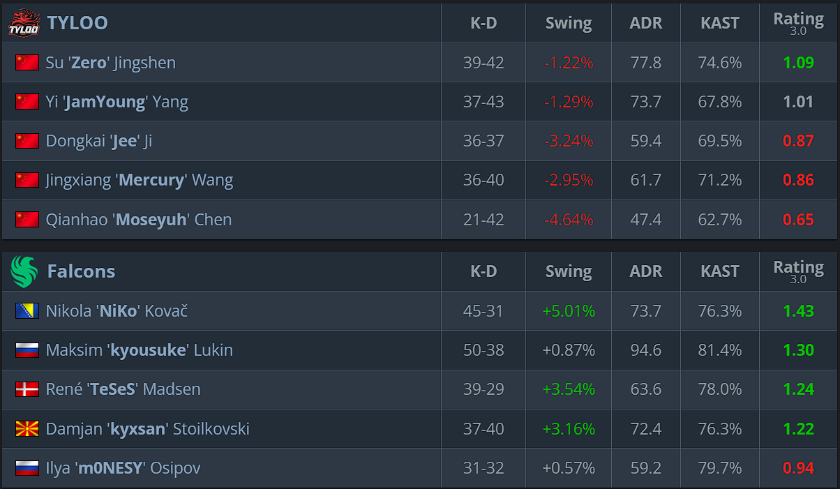 On their own pick, Falcons completely turned the series around. The team dominated in every aspect of the game — from opening duels to map control and economy. TYLOO were given almost no room to respond, and the map turned into a one-sided display of the favorite’s superiority. - Mirage (decider) — 13:2