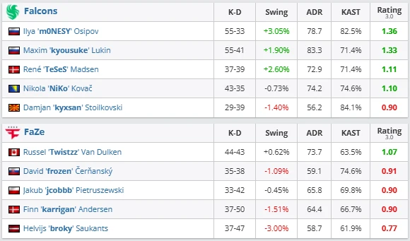 FaZe picked Anubis, but Falcons dictated the tempo. m0NESY controlled mid and punished overextensions, finishing the series with 55–33 and a 1.36 rating. kyousuke and TeSeS provided consistent trade efficiency, while NiKo’s impact rounds helped secure key economic swings. FaZe showed flashes through Twistzz, but struggled to maintain map control.
