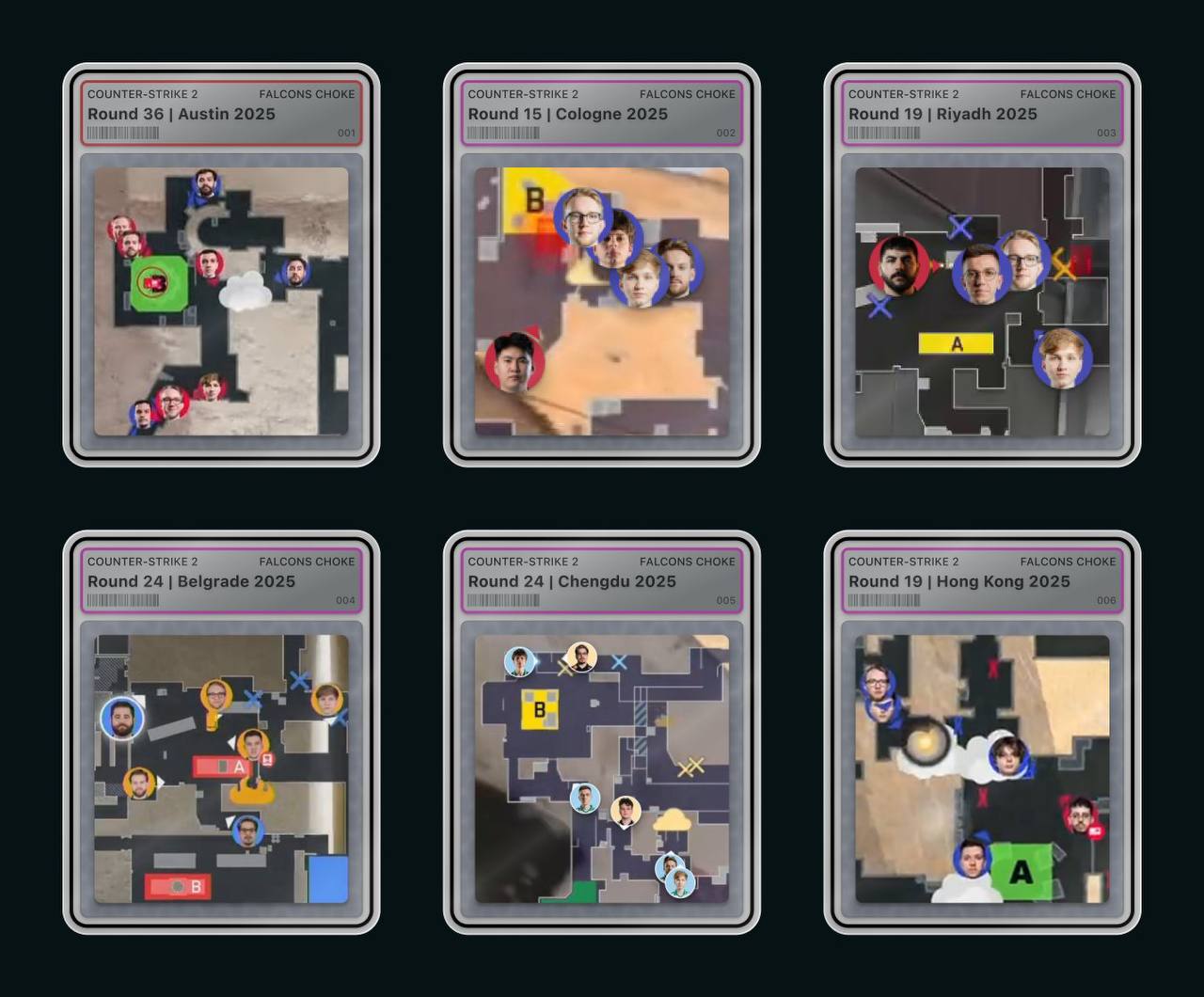 Community analysts have prepared a series of six cards that capture the most dramatic and defining situations Falcons faced in different cities and at different tournaments. Each card is a snapshot of a moment that shaped the team’s tournament journey: from a lost advantage in Austin to a nerve-wracking round in Hong Kong.