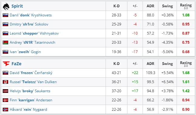 For Spirit, donk (28–33, 1.08 rating) was the only bright spot, but even his efforts couldn’t change the outcome. The rest of the team struggled to find impact, losing most of their duels and momentum early.