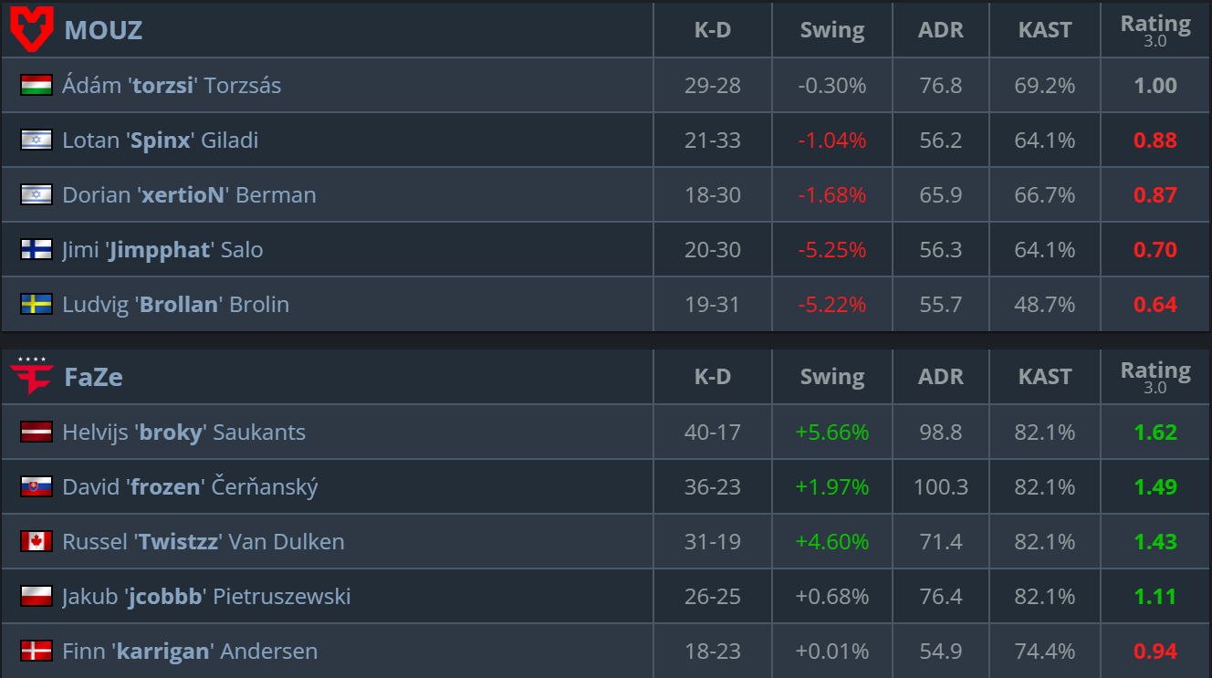 MOUZ looked confident at the start and put up a strong fight in the first half, but after the side switch FaZe significantly increased the pace. frozen and Twistzz consistently opened rounds, while broky won key AWP duels, preventing MOUZ from stabilizing their economy. The closing stages of the map were fully controlled by FaZe.