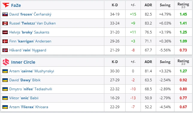 For Inner Circle, the standout was Artem “cairne” Mushynskyi — 30–30 K–D, 81.4 ADR, 1.27 rating — who led his team by example and won several key duels against FaZe’s riflers. Yet, his teammates couldn’t match his impact: Dawy (0.92) and nifee (0.80) fought hard but lacked consistency, while on1c and Flierax struggled to find rhythm.
