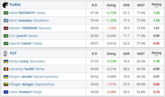 FUT opened strongly on Mirage, capitalizing on early mid control and forcing FURIA into reactive defensive setups. cmtry and lauNX found key entries, and FUT closed the map 13–9 after consistently winning late-round trades.