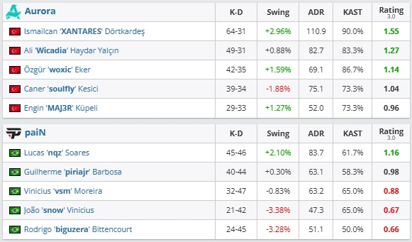 The decider was one-sided. Aurora dictated mid from the opening rounds, repeatedly forcing paiN into low-buy situations. XANTARES delivered a dominant individual performance, shutting down any comeback attempts and closing Dust2 13–4.