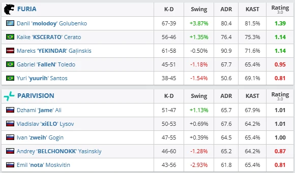 PARIVISION once again showed strong structure and mid-round calling. Jame’s control kept the series competitive, and their resilience on Inferno highlighted why they reached the 2–1 pool. However, FURIA’s individuals peaked at the right time. Their late-round discipline on Dust2 and controlled execution on Mirage separated the teams when margins were thin. In playoff-deciding matches, small details decide everything.