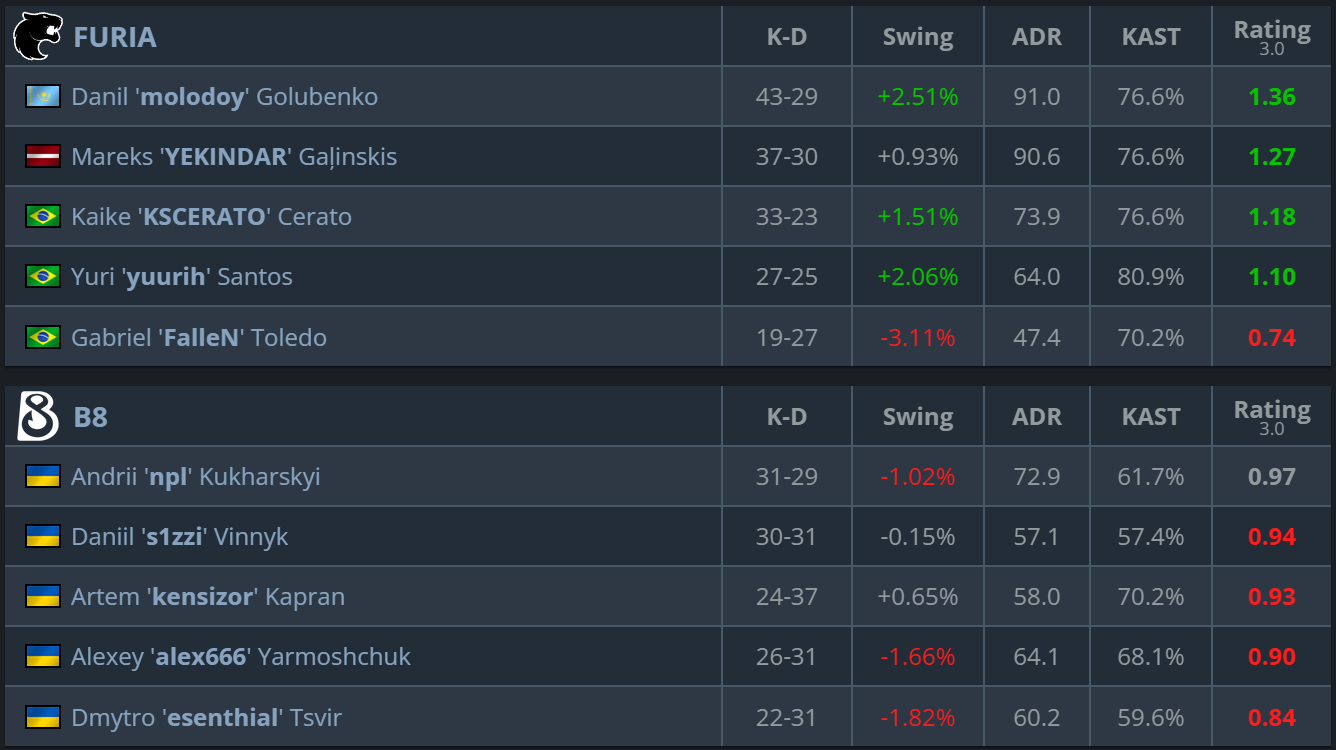 B8 delivered a competitive performance and maintained the tempo for most of the map. However, in the decisive rounds, FURIA demonstrated superior structural discipline and conversion of key moments. Economy control and consistently effective trades allowed the Brazilian side to close out a tense opener. - Inferno (FURIA pick) — 13:10