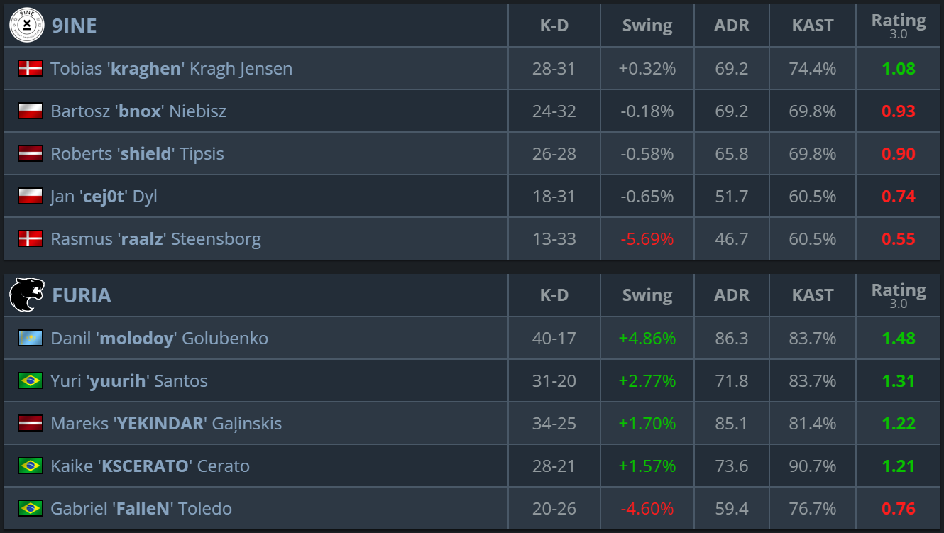 FURIA quietly confirmed their class and their status as one of the leaders of the world scene. The series was fully under their control, without any real crisis moments. 9INE tried to impose a fight, but the difference in individual level and overall consistency proved decisive.