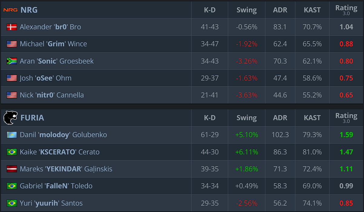 FURIA won the series thanks to strong adaptation after losing Mirage and complete control of the next two maps. While NRG initially looked ready to impose a long and competitive fight, the shift to Nuke drastically changed the match in favor of the Brazilians. The decisive factor was molodoy’s individual dominance and FURIA’s overall structure in the second half of the series. As a result, FURIA advance to the lower final, while NRG are eliminated from the tournament.