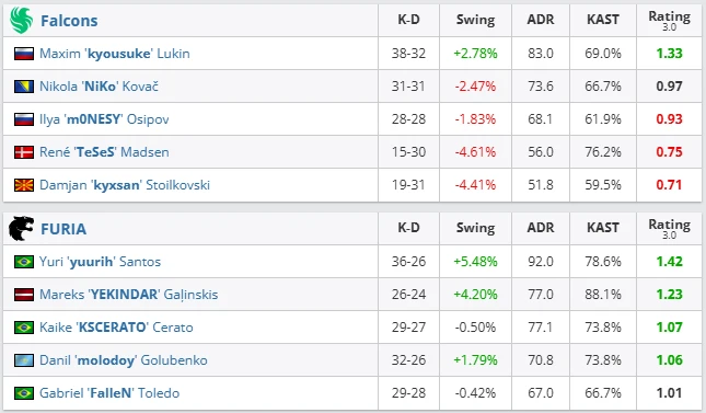 Falcons finally showed resistance on their own pick. NiKo opened with four consecutive entry kills, while kyxsan executed smart mid-round fakes to tie the score 9–9. But FURIA’s composure and experience prevailed. YEKINDAR clutched a vital 1v2, molodoy locked down post-plants, and FalleN controlled the tempo until the final round. The series closed 13–11, a clinical finish to a dominant performance.