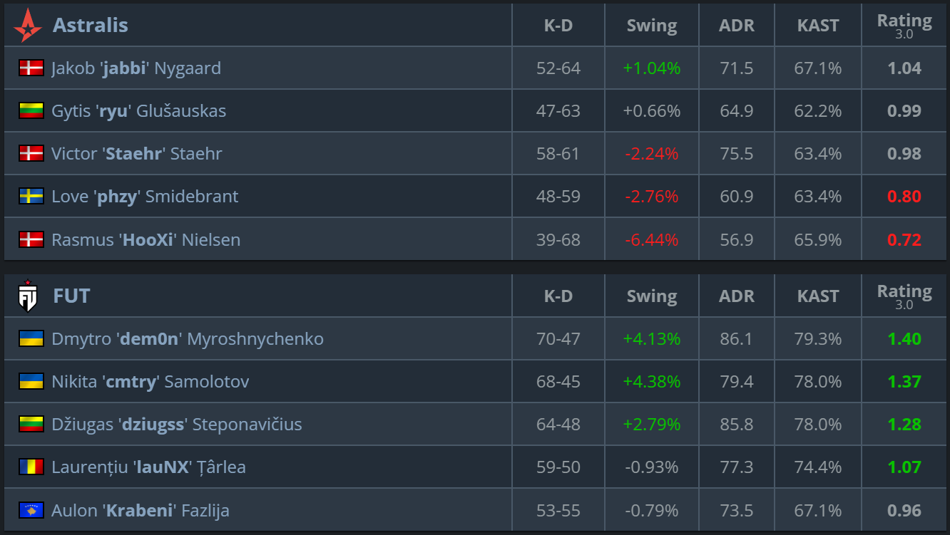 On their own pick, FUT only strengthened their advantage. The team continued to dictate the pace, worked better in the key moments, and did not allow Astralis to bring the suspense back. After two maps, FUT were fully controlling the final. - Nuke (Astralis’ pick) — 16:14