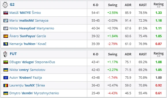 For FUT, the victory secured a 3–2 record, allowing them to claim one of the final playoff spots at ESL Pro League Season 23. Earlier in the stage, FUT recorded wins against HEROIC, B8, and now G2, while suffering defeats against 3DMAX and FURIA.