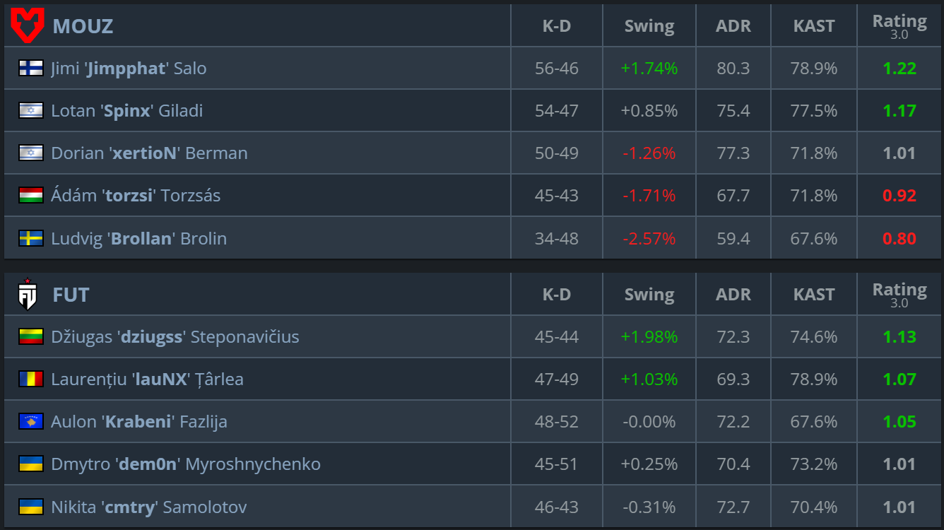FUT delivered one of the biggest upsets of the playoffs. The team managed to challenge one of the tournament favorites and win the decisive rounds on Mirage. For MOUZ, this defeat means the end of their run in Stockholm, while FUT continue their fight for the ESL Pro League Season 23 title.