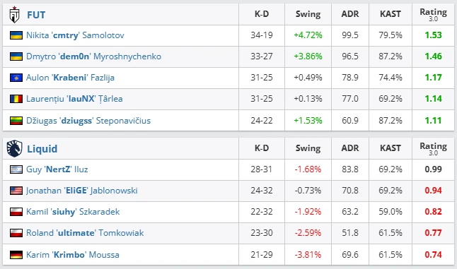 Nuke offered Liquid a brief window to respond, but the pattern remained familiar. While the first half stayed competitive, FUT consistently won the critical rounds that prevented Liquid from building momentum. On the T side, FUT maintained structure and patience, punishing overextensions and converting advantages calmly. Liquid’s resistance faded in the closing stages as FUT sealed Nuke 13:9 to complete the sweep.