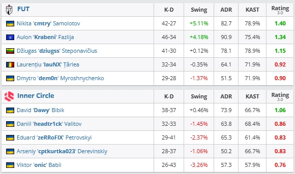 The opening map was firmly in the hands of the underdog. Inner Circle read their opponents well, won the majority of entry duels, and kept FUT on the back foot throughout. The key moment came in the mid-game, where FUT had a chance to recover but lost several crucial rounds in a row due to poor trading and positional mistakes. Inner Circle capitalized immediately and closed the map without major issues.
