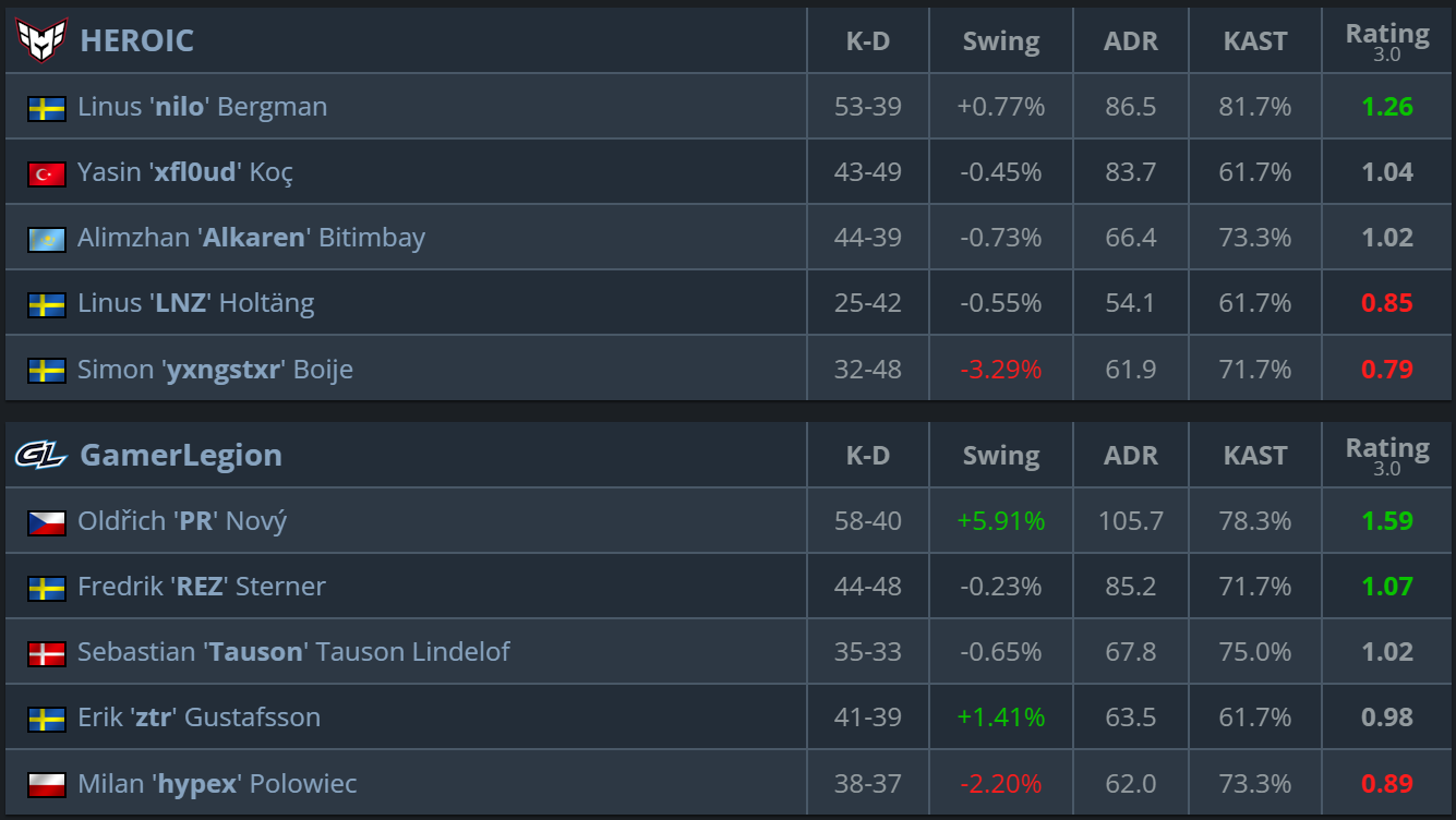 - Ancient (GamerLegion pick) — 8:13. HEROIC started strong, thanks to the precise play of nilo (53–39 K–D, 1.26 rating). Despite a solid offense from GamerLegion, HEROIC controlled the game on both halves.