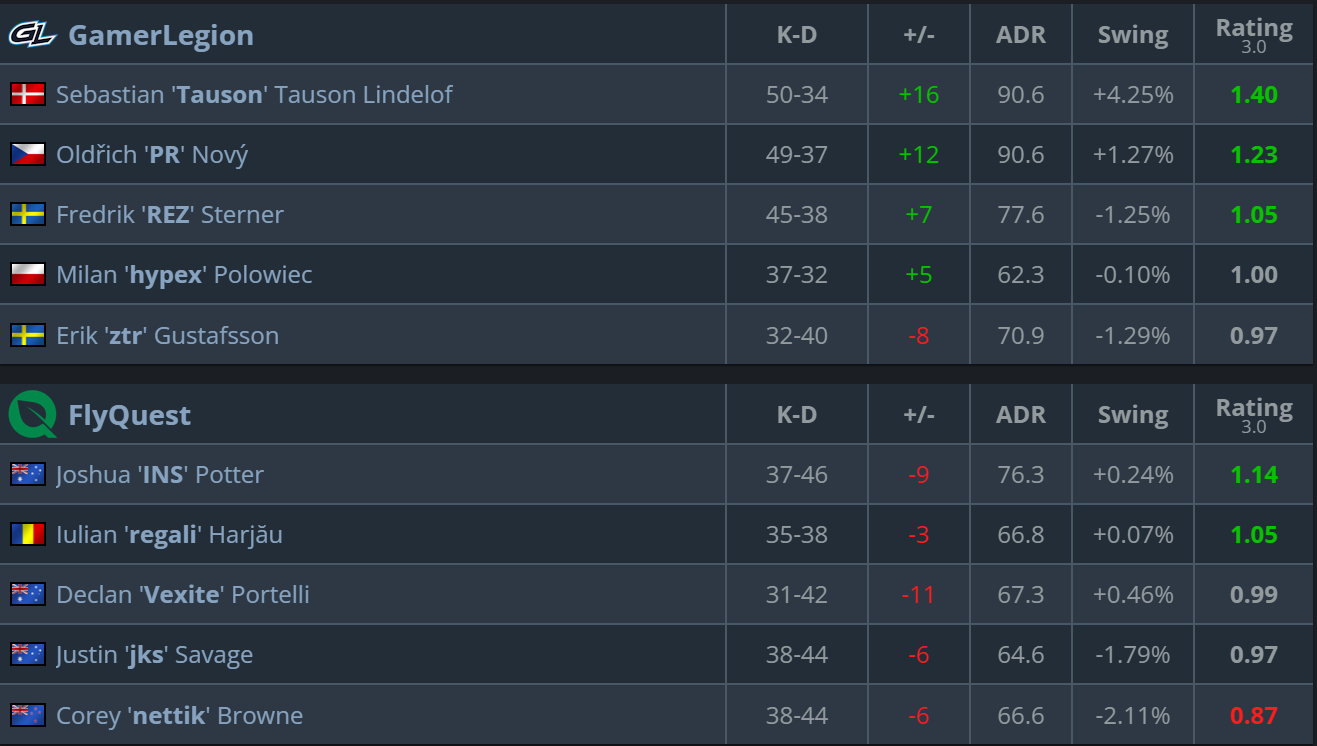 GamerLegion defeated FlyQuest with a 2:0 score (19:15 Dust2, 13:11 Overpass), showing stability and composure in crucial moments.