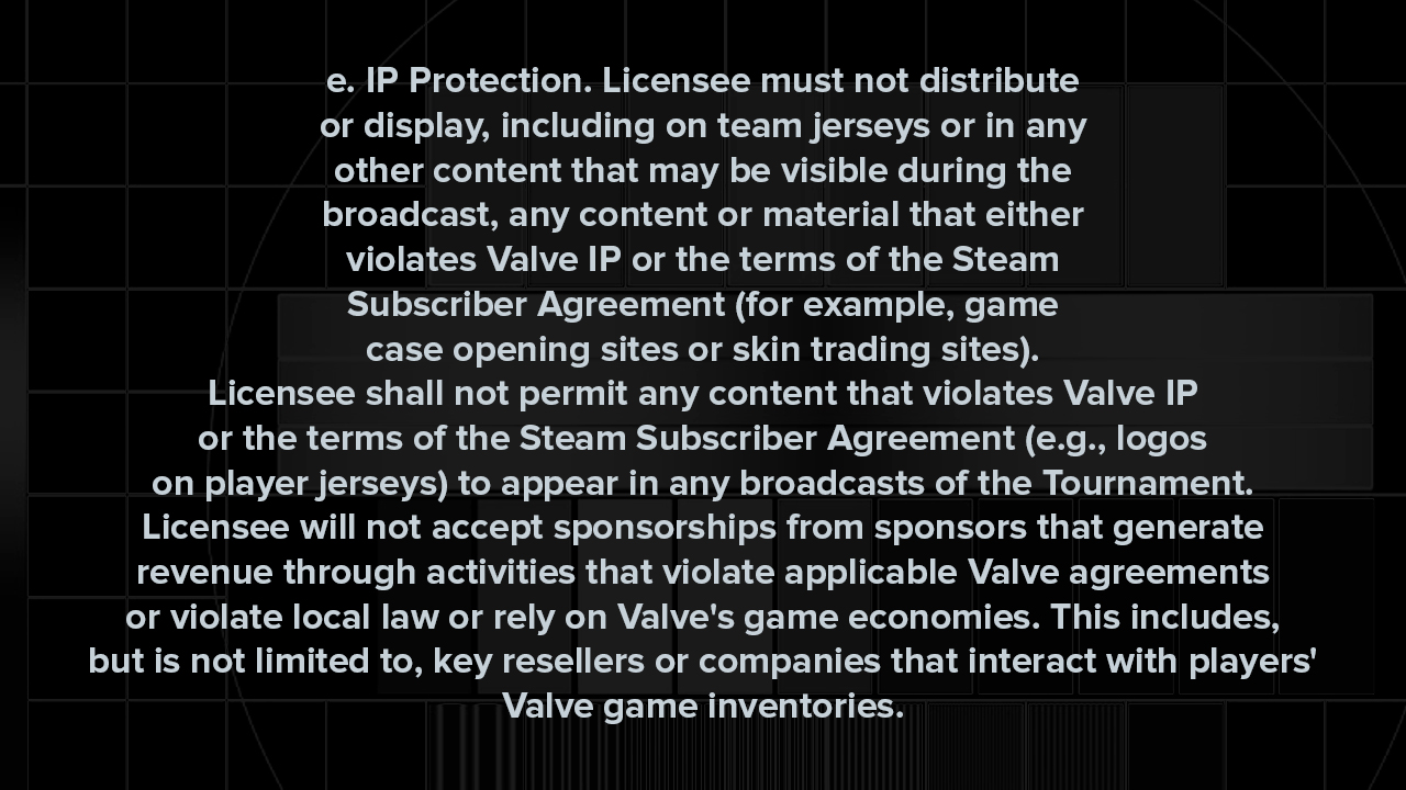 The updated “IP Protection” clause states that licensees may not distribute or display any content during broadcasts that violates Valve IP or the Steam Subscriber Agreement. It provides examples such as case opening websites and skintrading platforms. It also specifies that organisers and teams may not accept sponsorships from businesses whose revenue models violate Valve agreements, local law, or rely directly on Valve’s game economy systems. This includes key resellers and companies that interact with player inventories.