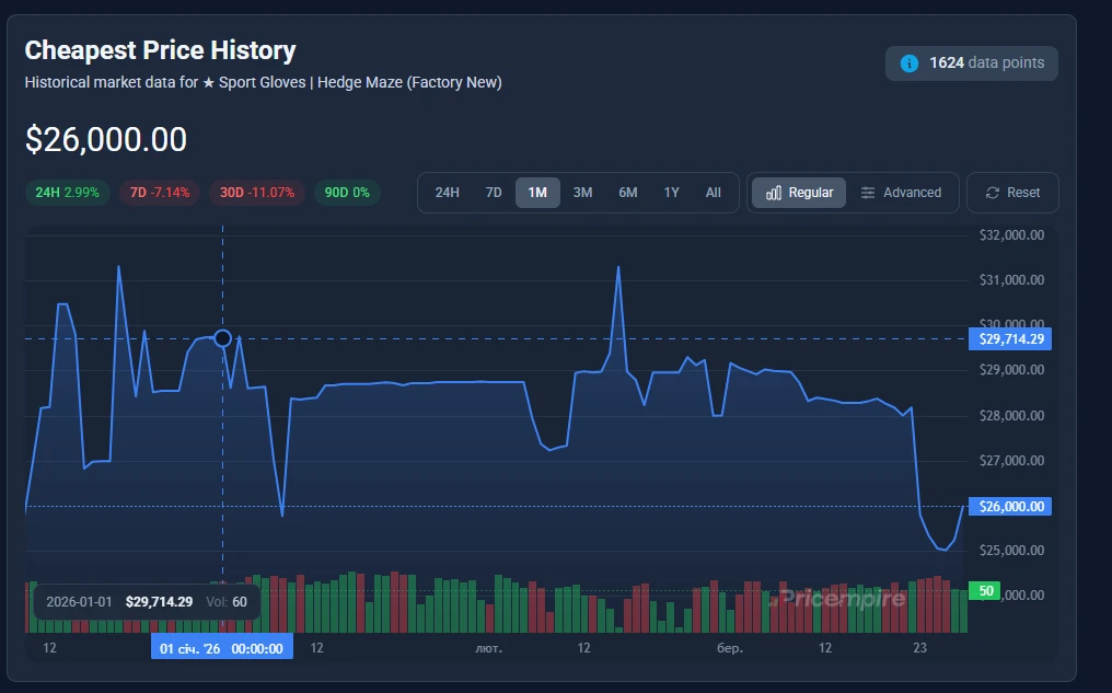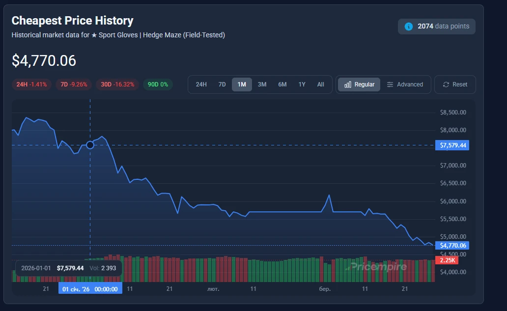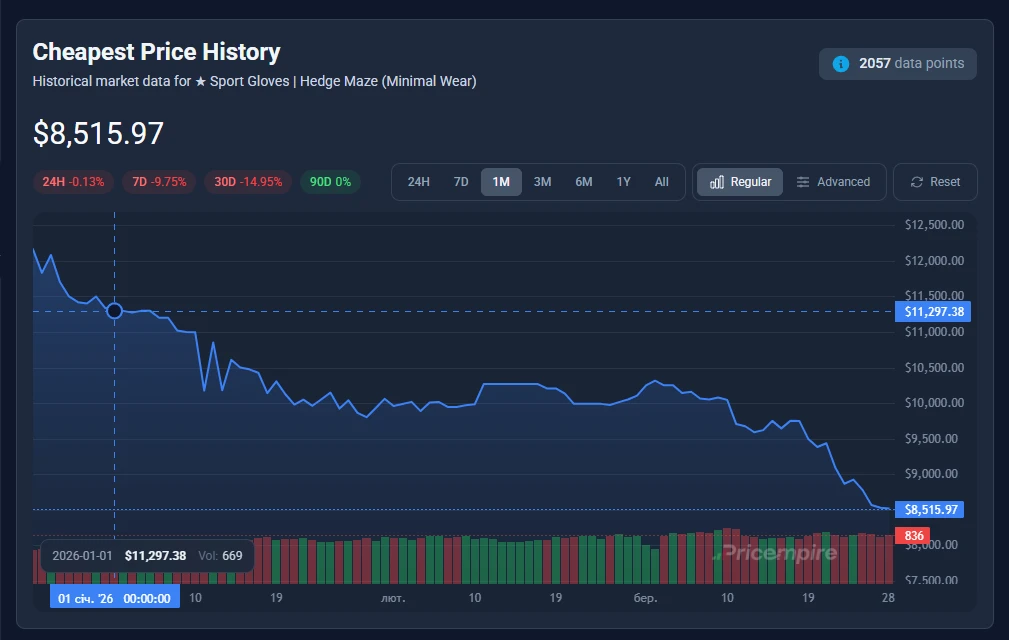 The start of 2026 has turned unexpectedly harsh for owners of high-end gloves in CS2. One of the clearest examples is Sport Gloves | Hedge Maze — once considered a stable high-tier asset, now showing a sharp decline across all conditions.
