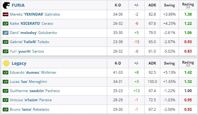 On Mirage, FURIA had the opportunity to even the series. They kept the game close into the second half, but Legacy showed nerves of steel in the clutch. Several decisive plays from dumau and the consistency of lux (34-31, 1.32) sealed the map 13:11. Yuurih (26-32, 0.83) had an especially poor showing, never finding his rhythm. In contrast, saadin (35-23, 1.00 rating) helped Legacy maintain the tempo and deny FURIA’s comeback attempts.